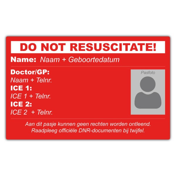 Let op: aan het dragen van dit DNR-pasje kunnen geen rechten worden ontleend. Het pasje dient ter informatie en maakt je wens duidelijk, maar vervangt geen officieel, medisch DNR-document.