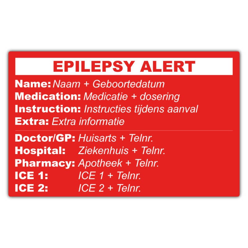 Het Epilepsie Alert pasje is een essentieel hulpmiddel voor iedereen met epilepsie. Bestel eenvoudig jouw gepersonaliseerde pasje online, voorzien van je belangrijkste medische informatie en noodinstructies. Dit pasje biedt extra zekerheid in noodsituaties, zodat hulpverleners direct weten hoe ze moeten handelen tijdens een aanval en welke zorg je nodig hebt. Daarnaast is het ideaal om altijd bij je te dragen, bijvoorbeeld tijdens het reizen, op het werk, of in het dagelijks leven, zodat je met een gerust hart op pad kunt. Praktisch, overzichtelijk en levensreddend!
